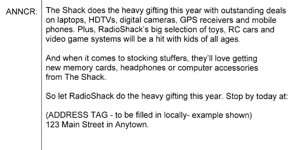 - RadioShack, Michaels, Alco: miscellaneous radio spots for special events like the annual after-Thanksgiving sale, new product rollouts, grand openings and radio station appearances at stores.