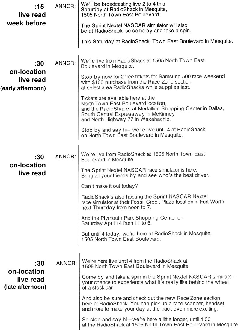 one :15 ad promoting the station’s appearance at the store before the event, and three :30 on-location live reads on location the day of the ad.