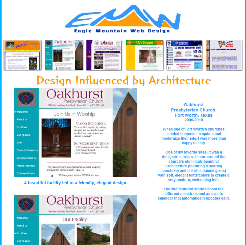 Eagle Mountain Web Design Published in Stuff I’ve Written for the Web | Full Size: 800 × 798 Websites This is my online portfolio showcasing my web work over the years. Both comments and trackbacks are currently closed. ← Previous Next →