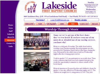 First Baptist Church of Lakeside, TX Published in Stuff I’ve Written for the Web | Full Size: 398 × 296 Website Design/Content Management At nearly 50 pages, this expansive site got about 450 visits a week and was extremely easy to find via most search engines. Both comments and trackbacks are currently closed. ← Previous Next →