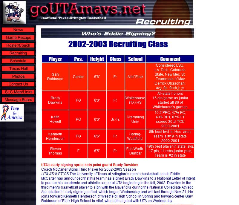 UT Arlington Fan Site Published in Stuff I’ve Written for the Web | Full Size: 800 × 686 Website Design/Content Management This site appeared at several addresses over a couple of years. I was told it was shown to potential recruits and got about 20-50 visitors a week. Both comments and trackbacks are currently closed. ← Previous Next →